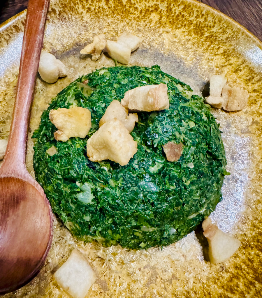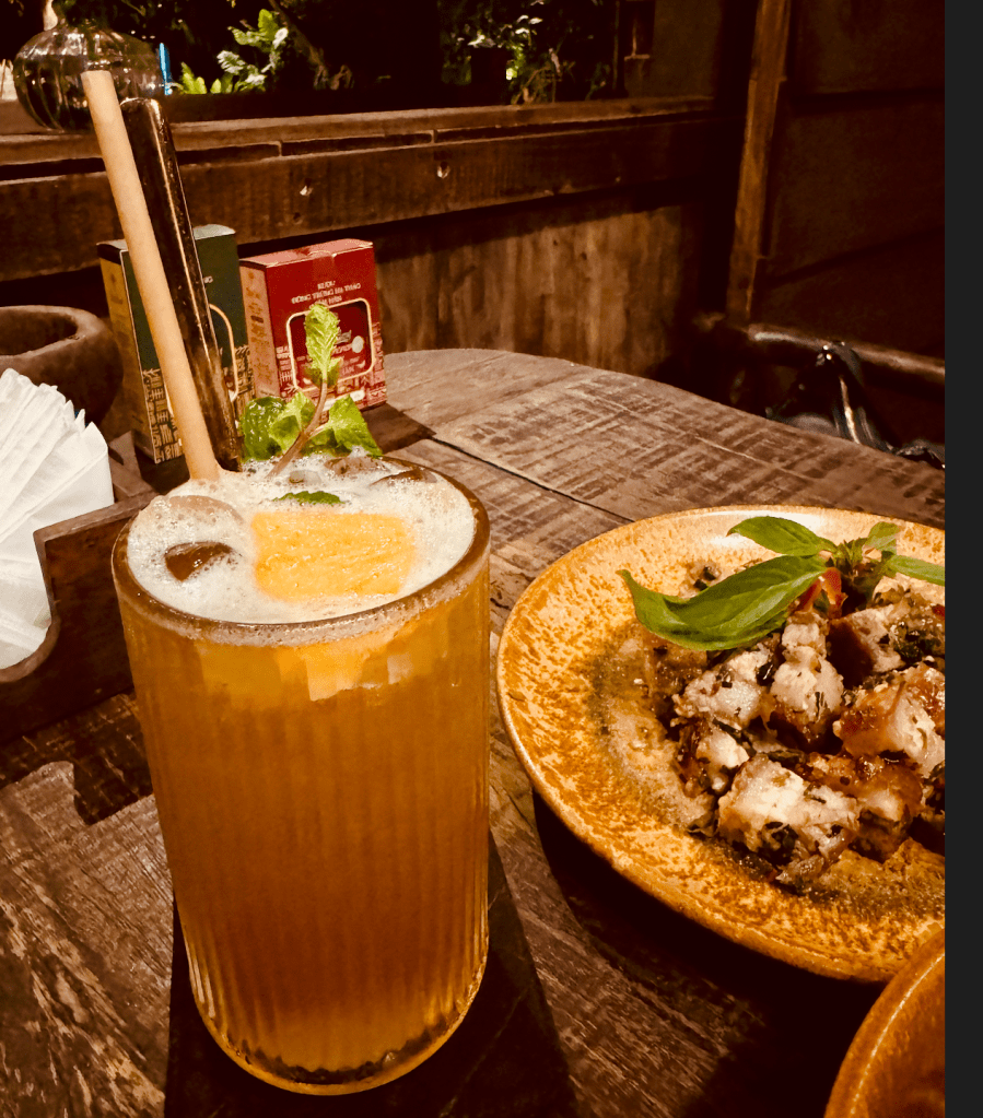 Before the meal, they treated us to a refreshing passion fruit juice served in the fruit’s original rind/outer shell. We ordered three items from the extensive menu for our dinner tonight. Mango salad with sun-dried tilapia, roasted pork belly with local herbs and Ede salt, and my favourite – Lá mì xào ba rọi (Stir-fried cassava leaves with pork belly). It was such a visual and delicious culinary treat. I was so happy and full at the same time.